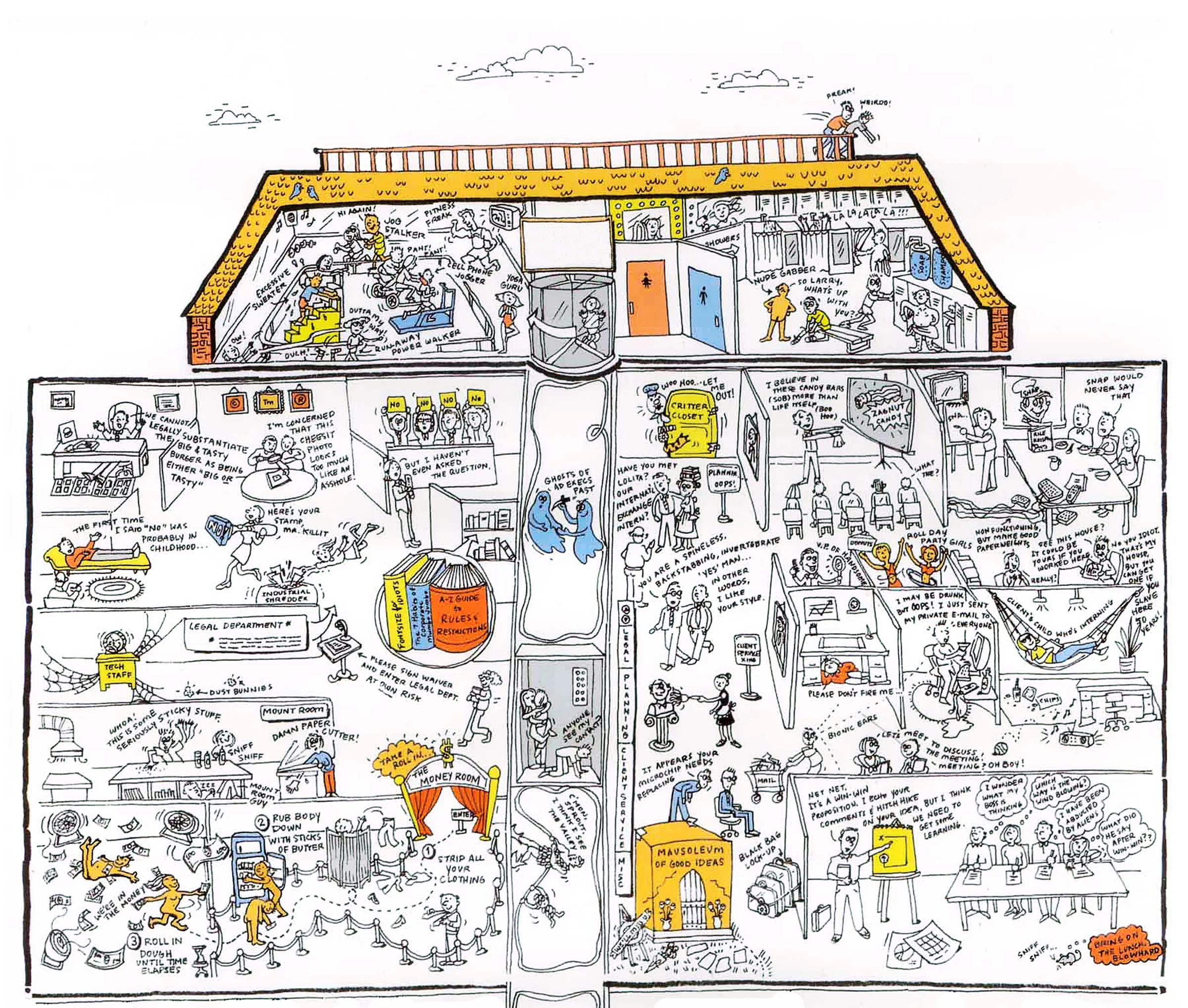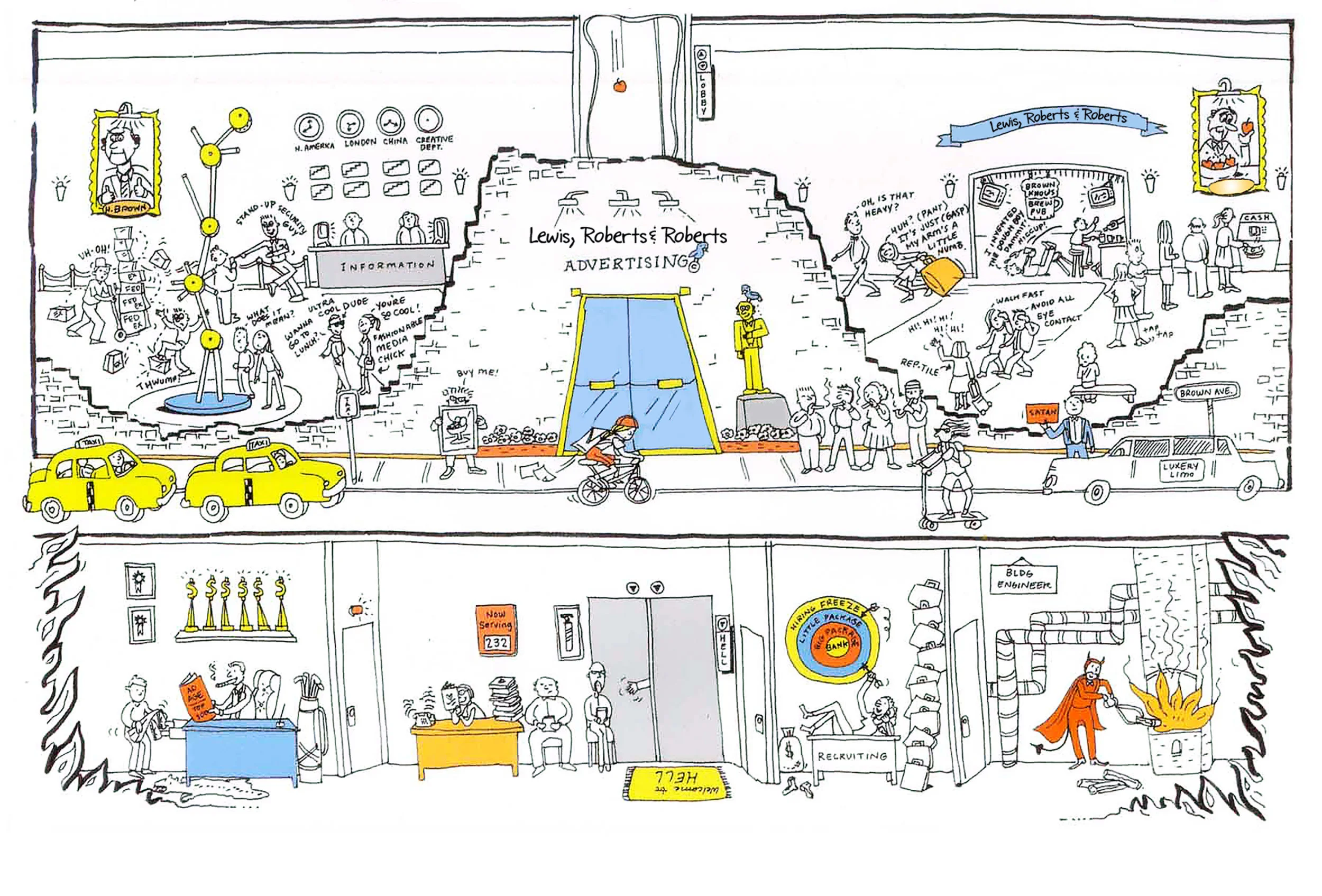 This is a cross-section of life inside an advertising agency. It was an ongoing project that I illustrated and developed with and for my former boss, John Montgomery. While some agency details have ultimately changed, much of the illustration remains relevant today. This wonky portrayal of life in the ad biz ultimately lived on as a poster, which helped John pitch the CBS series, "The Crazy Ones."